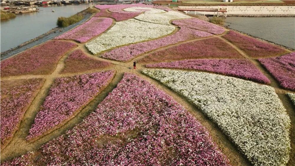 在安徽省巢湖市中庙街道,市民在巢湖边的一处花海里休闲(2018年10月12日无人机拍摄)。新华社记者 张端 摄