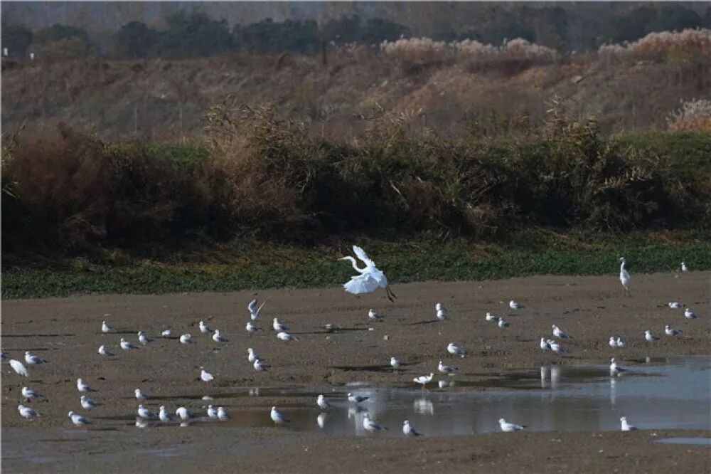 安徽巢湖边的一处湿地,鸟类翔集(11月22日摄)。新华社记者 张端 摄