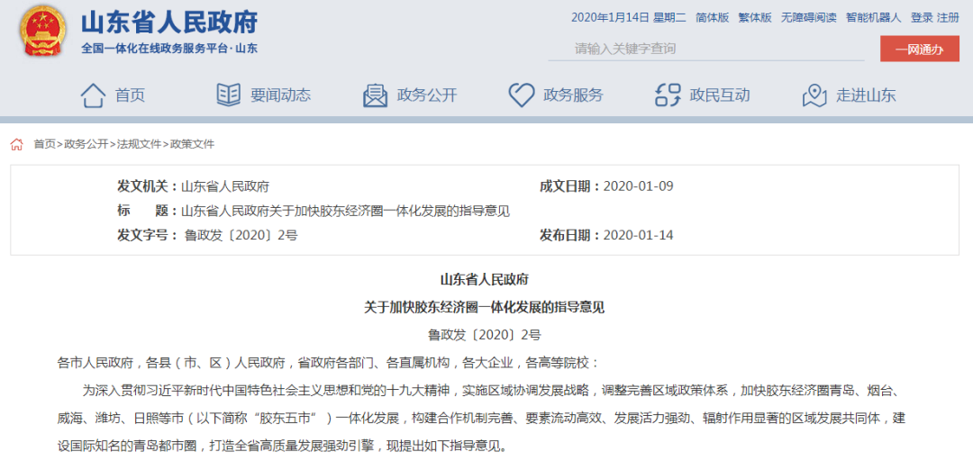 《意见》提到,为深入贯彻习近平新时代中国特色社会主义思想和党的十九大精神,实施区域协调发展战略,调整完善区域政策体系,加快胶东经济圈青岛、烟台、威海、潍坊、日照等市(以下简称“胶东五市”)一体化发展,构建合作机制完善、要素流动高效、发展活力强劲、辐射作用显著的区域发展共同体,建设国际知名的青岛都市圈,打造全省高质量发展强劲引擎,现提出此指导意见。