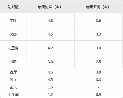 房间的空间尺度大小没有统一标准,一般根据户型大小调整,但为了考虑家具摆放和正常活动,会有一个最低开间进深参考值: