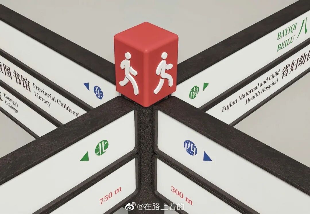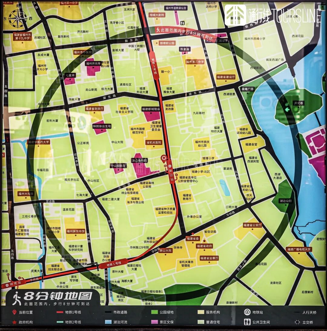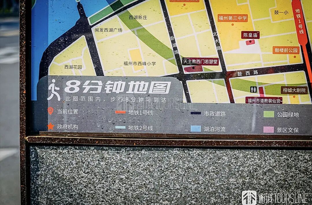 其中特别值得一提的是,人行标识系统增加了福州指引地图,利用心理地图概念,结合适宜的步行距离,绘制“8分钟地图”,即步行8分钟内可达,鼓励人们步行前往目的地。