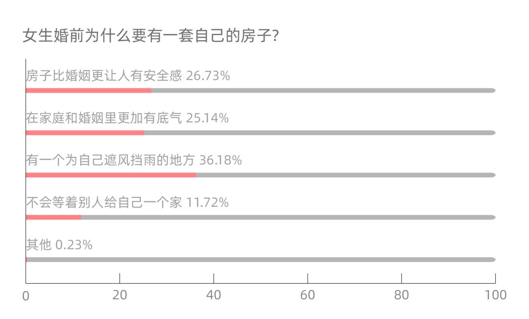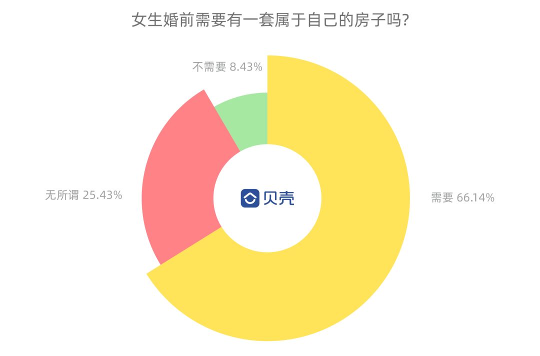 调查中,66%的女生认为婚前需要有一套属于自己的房子,95后女生持此观点的甚至高达7成。“需要一个遮风挡雨的地方”、“房子比婚姻更让人有安全感”、“在家庭和婚姻中更有底气”是她们的内心写照。