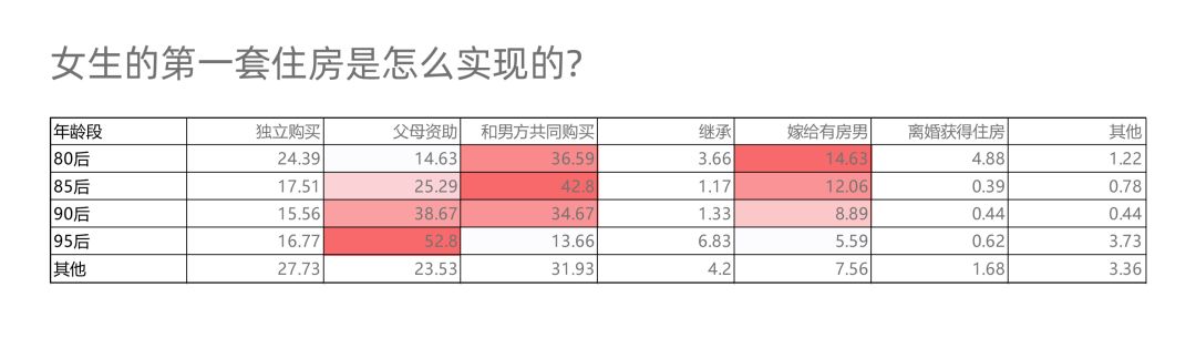 不过,男同胞们先不要慌张,其实大多数女生并不会把买房的负担全部压在男方身上。近57%的女生同意和男方共同筹措婚房首付,而且越年轻越主张共同购买,而80后的传统观念最强。