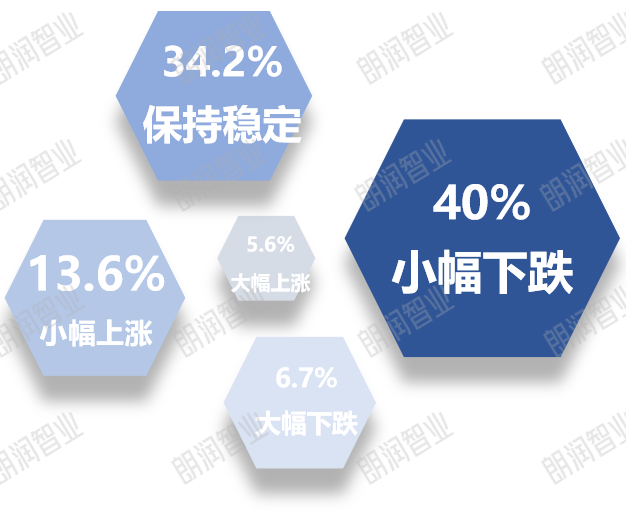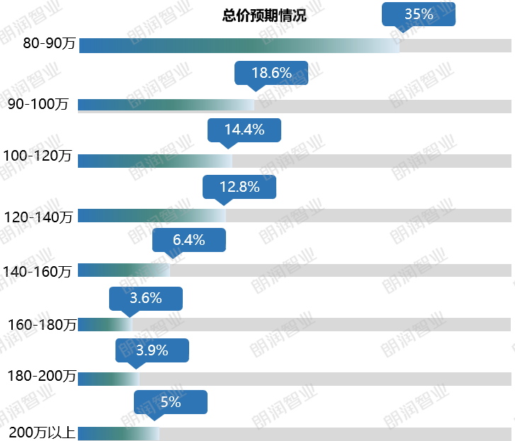 客户对房价预期发生变化,针对疫情之后的房价走势,调查显示,四成客户认为会小幅下跌,三成客户认为会保持稳定,大部分客户对房价预期较低,期待未来开发商会降价来促进销售,将迎来更大降价空间,因此进入观望期,卖方市场因此还会面临一定压力。 为何约有四成客户认为房价会跌?我们认为可能有以下几点因素: 1.房企压力大。因房企售楼部关闭,无法卖出房子,导致回款不足,销售业绩和现金流自然要受影响。所以部分房企会因为债务压力,降价去化。 2.供求端失衡。企业未能复工,甚至破产,部分客户失业、降薪,收入均大打折扣,有部分客户失去支付能力;客户购房观发生变化:在疫情下,人们对生命健康更看重,无暇考虑买房。供求端失衡会引发房企以价换量。 疫情之下经济发展滞缓,客户收入减少,支付能力下降,预期总价集中在80-90万;首付预期不变占比50%,下调占比43%;但改善需求仍存,预期总价在180万以上占比约9%;预期单价在9000-10000元/㎡客户占比57%。