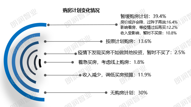 调查显示,仅有13.3%的受访者表示受疫情影响,收入降低或有其他投资渠道,暂时取消购房计划。绝大多数消费者因对房价预期变化或看房不便或收入情况等的影响,处于推迟或观望状态。而延缓时间集中在6-12个月;按原计划购房的仅占13.6%,选择线上购房的仅占1.8%。说明疫情之下,客户购房需求依然存在,只是延缓购房时间。