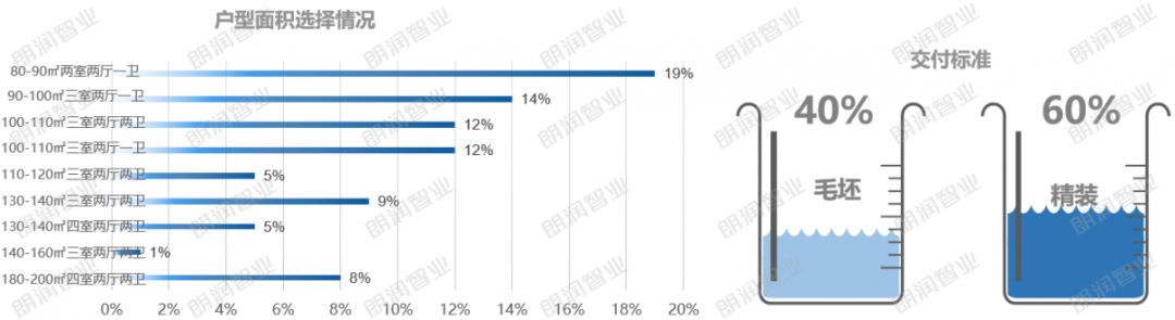 在户型的选择上,买房者因资金实力相对较弱,仍旧以小户型为主。其中19%的客户表示选择二居产品,38%客户选择90-110㎡小三居,四居产品仅占13%;据统计,在交付标准选择上,有40%客户倾向毛坯产品,愿意自己费时费力,提升装修的品质,另外6成客户会选择精装产品,精装仍为主流。
