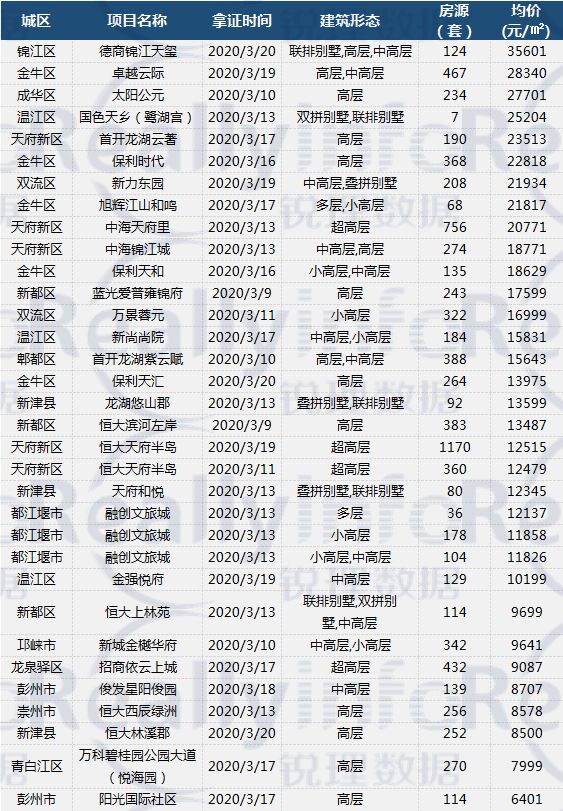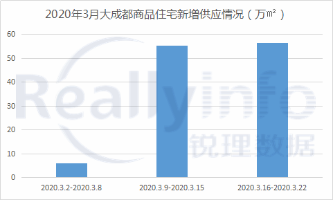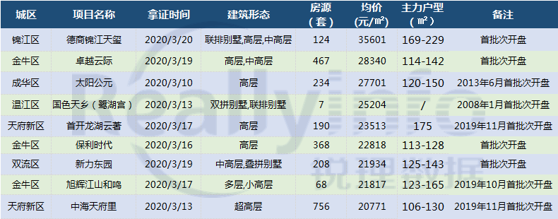 3月初始,虽有远郊几个项目拿证,但3月9日成都新都区接连发放两张预售证后,才真正拉开了房企“报复性出货”的序幕。通过下表可以看出,从3月9日开始,大成都商品住宅新增明显。因此,本文也将以2020年3月9日-2020年3月22日作为统计周期,复盘一下市场表现。