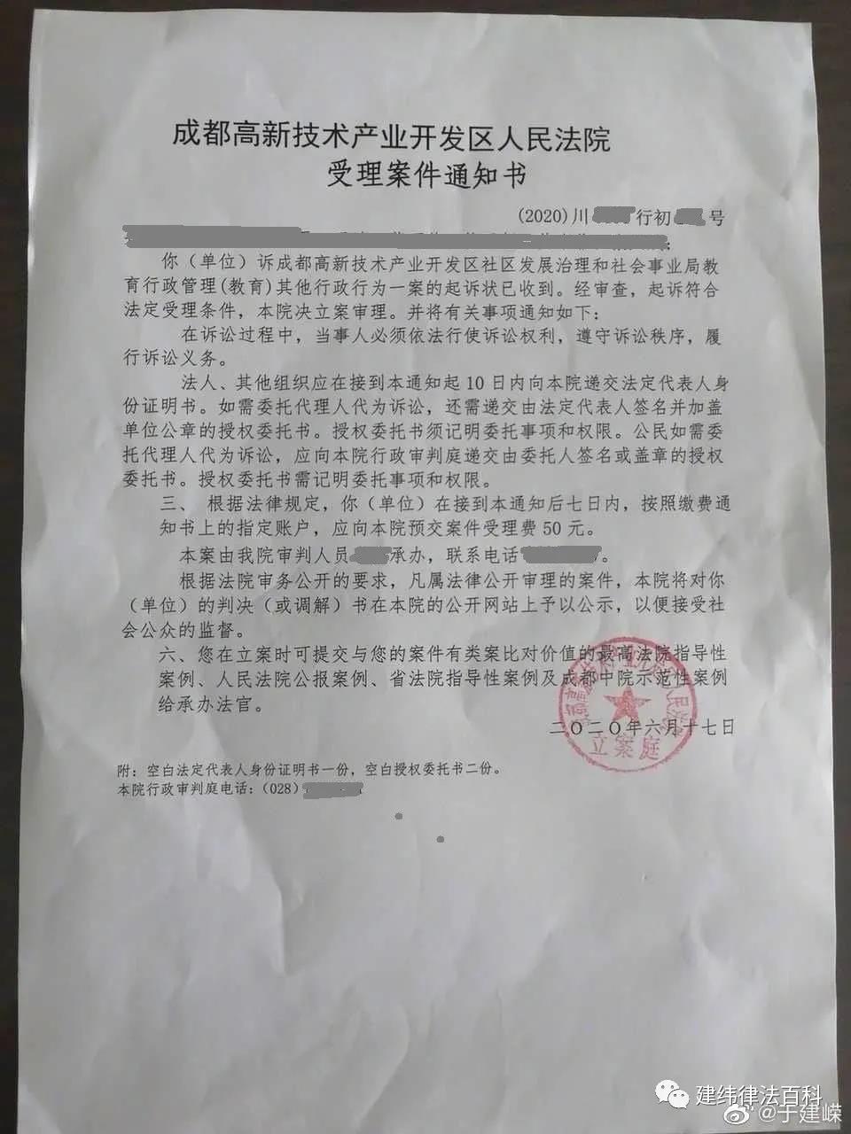 近日,提起行政诉讼的8位家长拿到了法院的受理通知书。