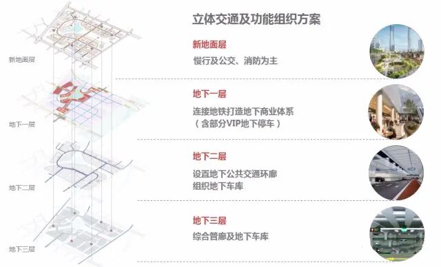 每一个TOD站点,都将进行地上、地下一体化设计。 >>> 地上一层,减少小汽车通行量,推动公交的利用率,建立慢行系统,将景观还给人,打造“步行者的天堂”; >>> 地下一层,4轨3站在这里交汇,在站点之间设置商业,并相互联通成片,联通后有望成为亚洲最大的地下商业; >>> 地下二层,车行道在这里互联互通,承接大量的车行需求; >>>地下三层,则将规划为停车场。 △地上地下一体化开发分层示意图(来源:网络)