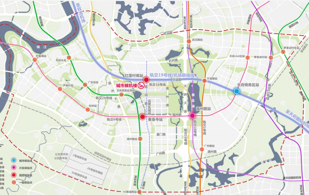 并且,这4条轨交线路,形成了3个TOD站点,即秦皇寺站、红莲村南站和天府商务区西站,高密度的轨交线路和TOD站点,极大提高了区域内各个功能组团间的联通效率。